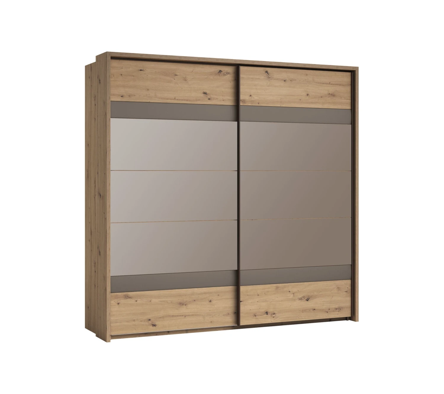 Un meuble fonctionnel et pratiqueCette armoire 2 portes coulissantes PRESTIGE vous permettra d’accueillir tous vos vêtements de manière organisée. Elle se dote d’espaces de rangement de dimensions et formats variés. Vos robes et chemises trouveront place dans la penderie. Cette armoire s’ouvre à l’aide de portes coulissantes : c’est très pratique pour gagner de la place dans votre chambre à coucher. Avec ses dimensions de L. 225 – H. 215 – P. 62 cm, cette armoire 2 portes conviendra pour une chambre d’adulte ou un dressing. Côté entretien, frottez ses surfaces à l’aide d’un chiffon sec et propre.Une armoire éléganteCette armoire 2 portes imitation chêne artisan agrandit la pièce grâce à son miroir teinté sur la façade avant. Pour une touche d’élégance supplémentaire, il se pare d’un effet maroquinerie. Le papier décor qui recouvre la structure de ce meuble imite naturellement le bois. Les poignées marron aspect rouillé ajoutent à son charme.