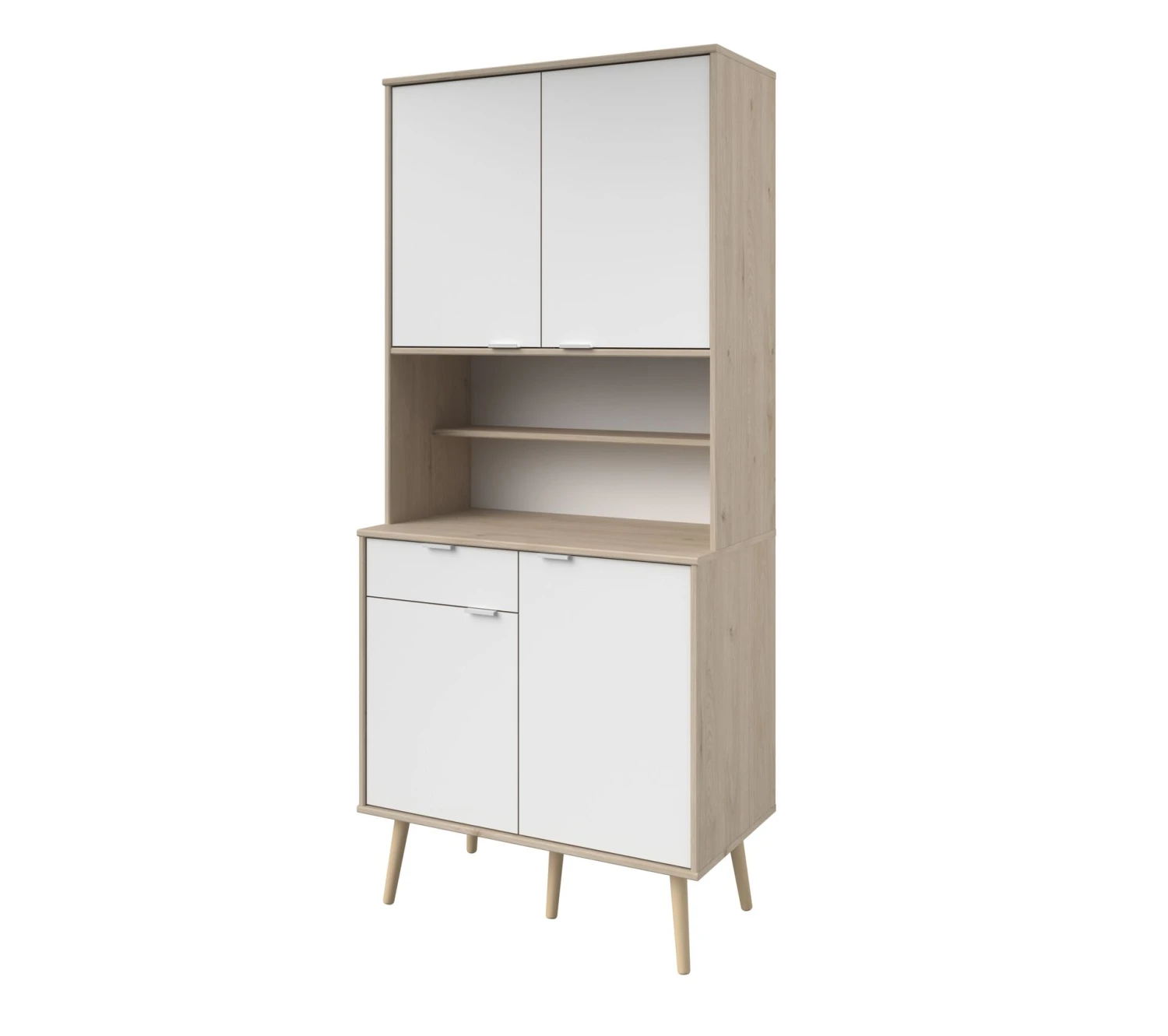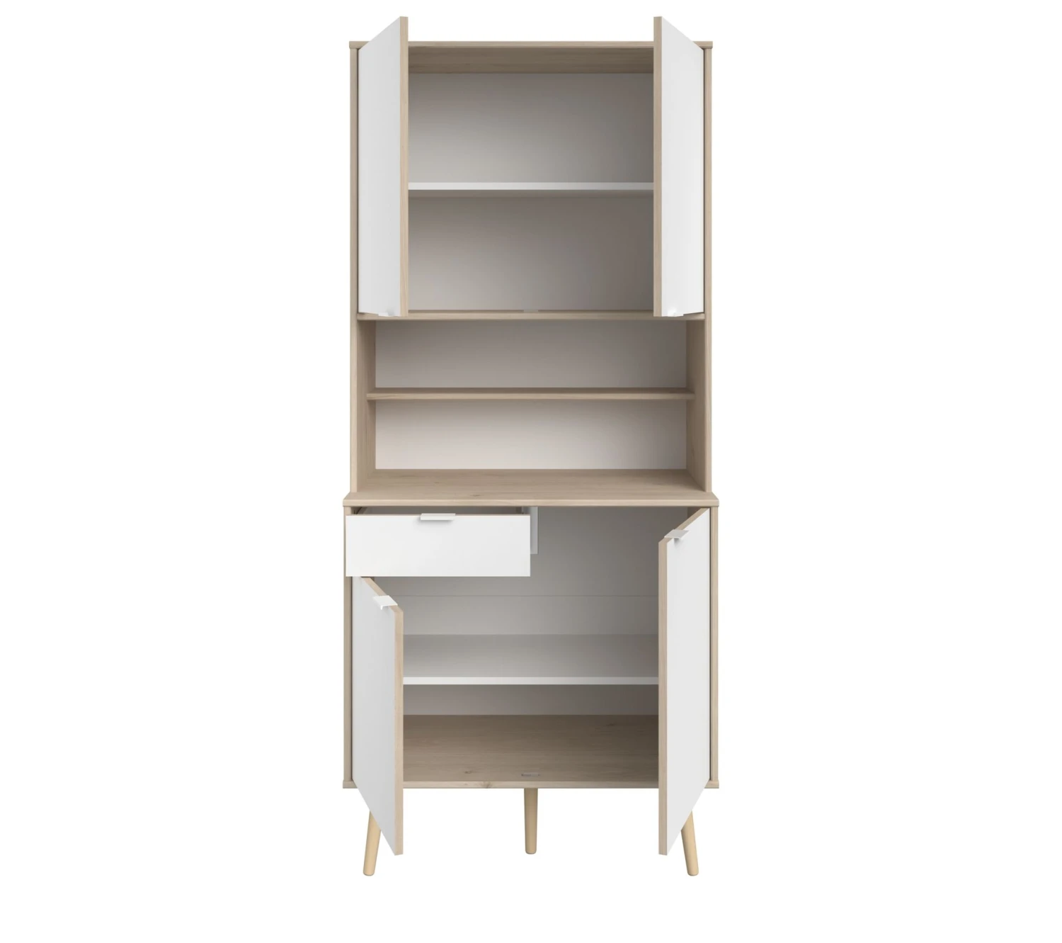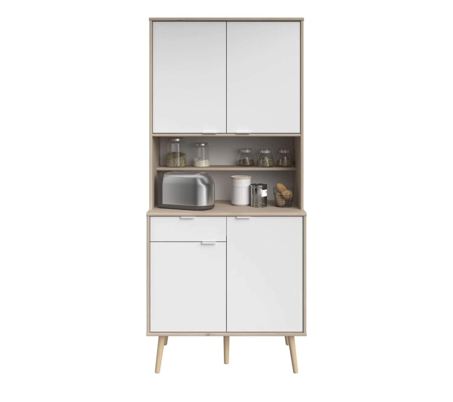 Deux placards avec portes, un tiroir, une étagère : ce buffet de dimensions 80 x 184,2 x 43,8 cm offre des espaces de rangement aussi spacieux que variés. Vos denrées alimentaires sèches aussi bien que votre vaisselle y trouveront leur place. Les pieds en chêne de ce buffet OLGA offrent un support solide aux deux placards, reliés entre eux par les rayonnages. Pratiques, les portes sont dotées de charnières à rappel automatique, pour une ouverture et une fermeture faciles. La structure en panneaux de particules de ce buffet est à la fois la garantie de sa robustesse et de sa facilité d’entretien.