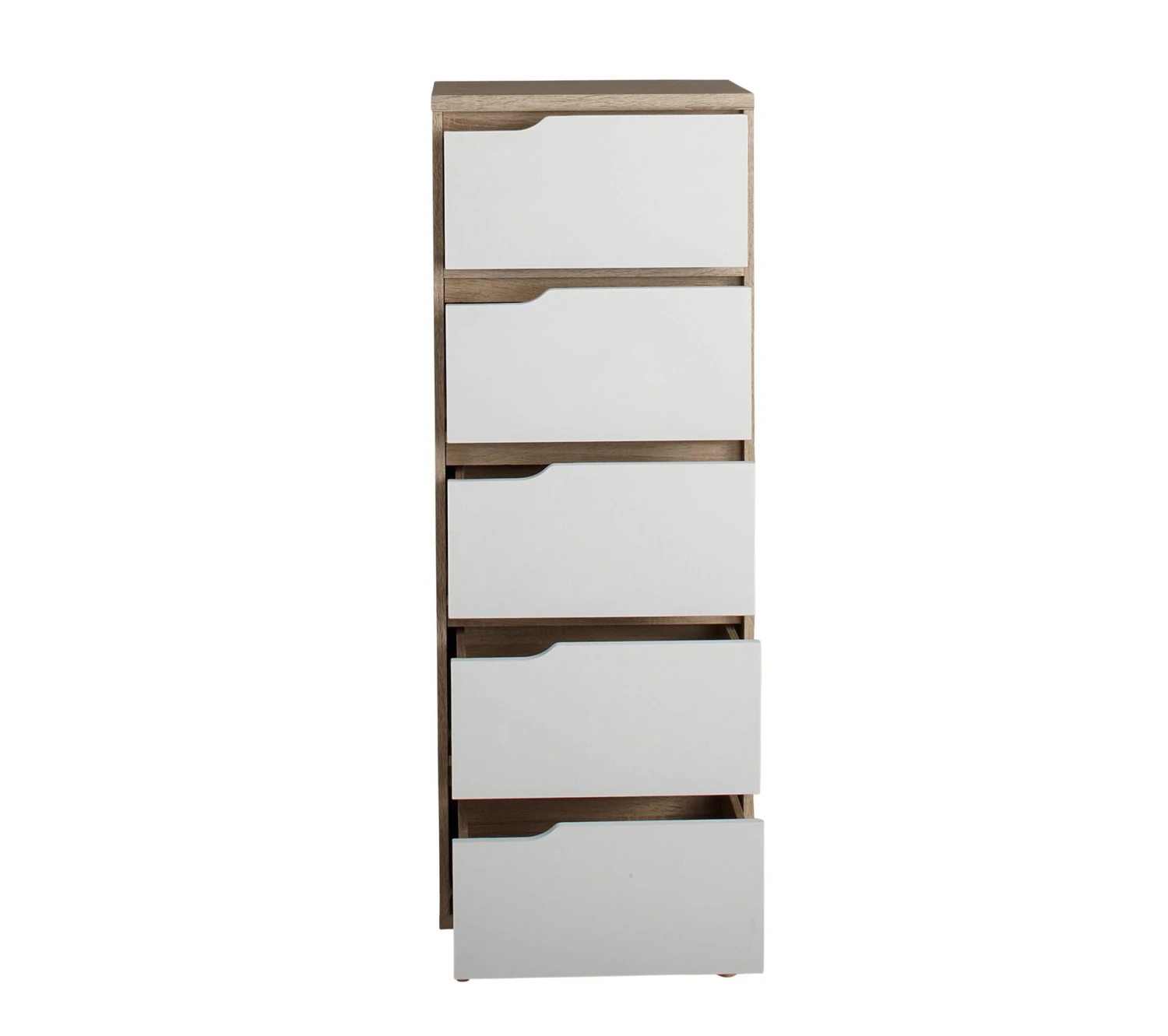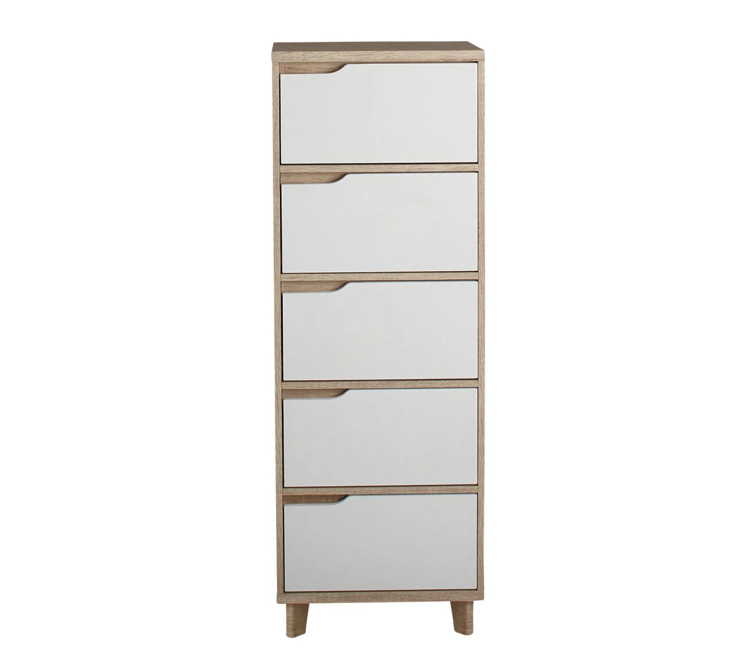 Le chiffonnier Nordic est la solution idéale pour ranger de nombreux accessoires de mode, de la lingerie et bien plus. Grâce à ses 5 tiroirs munis d’une encoche qui s’ouvrent facilement, il permet d’organiser efficacement les affaires et d’avoir tout à portée de main. Ce chiffonnier de L. 47 x h. 134,2 x P. 39 cm est peu encombrant grâce à sa structure allongée qui prend peu de place au sol et sera parfait dans la chambre ou le dressing. Pour l’entretien, il suffit d’utiliser un chiffon doux et propre pour enlever la poussière qui s’accumule au quotidien.