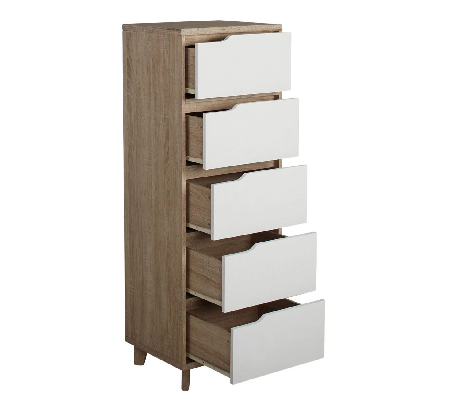 Ce chiffonnier imitation chêne et blanc est proposé dans un style scandinave dans l’air du temps. Ses deux coloris permettent de l’associer à tout type de mobilier de chambre, qu’il soit blanc, de couleur chêne ou les deux pour une harmonie parfaite. Confectionné en panneaux alvéolaires, ce chiffonnier est rehaussé de pieds légèrement inclinés.