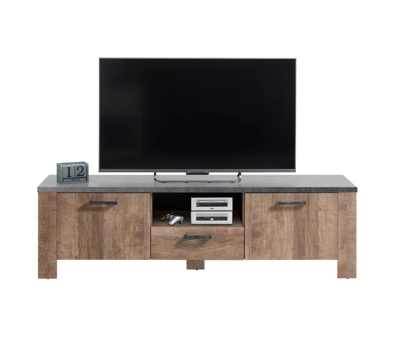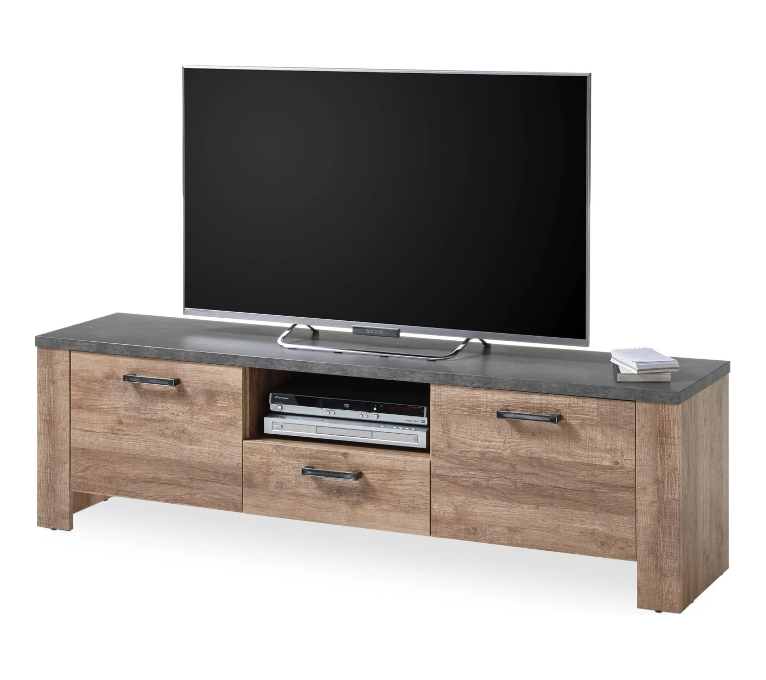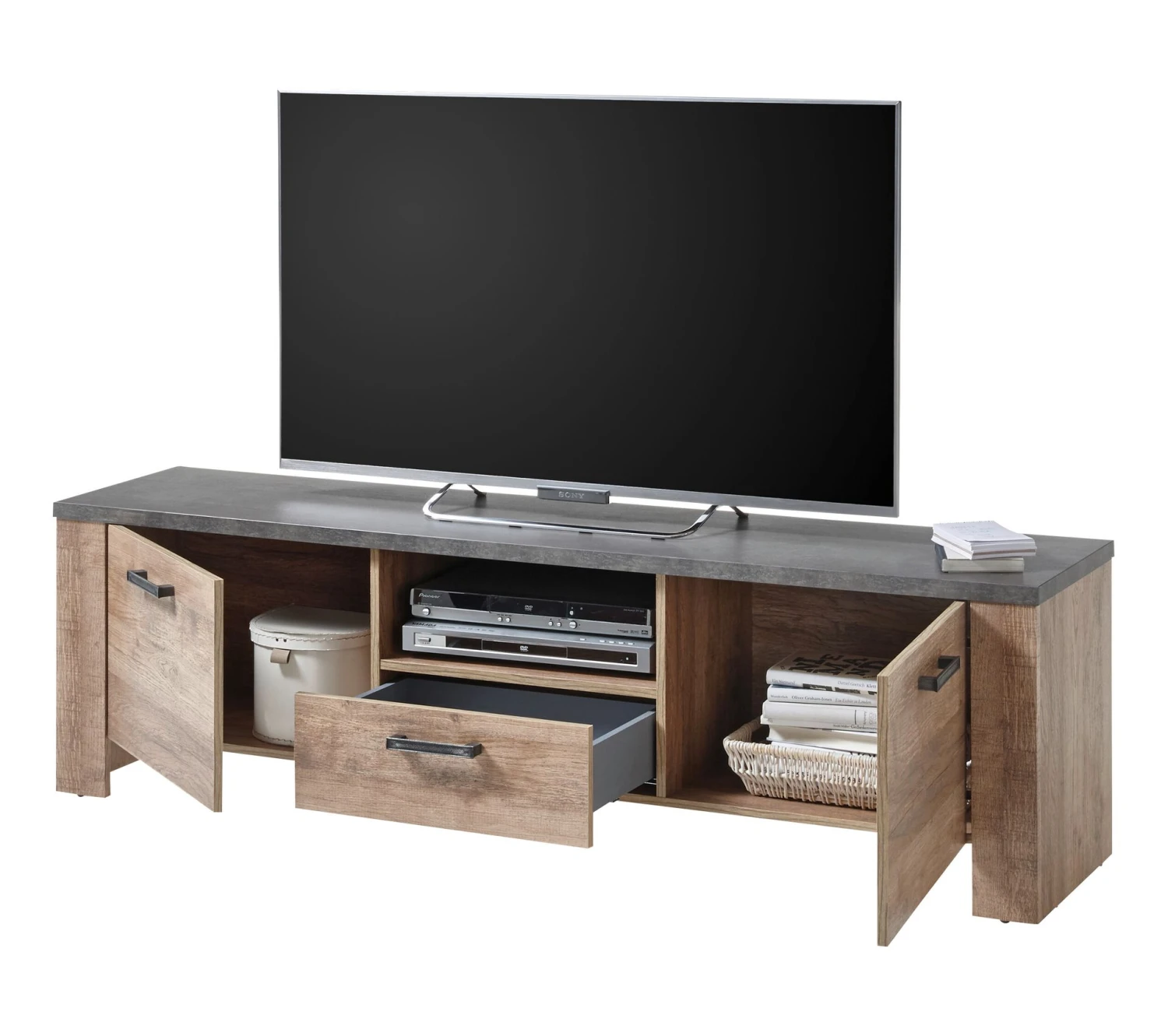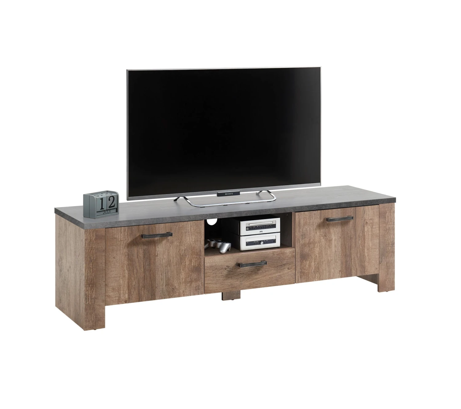 - Structure en panneaux de particules décors papier, imitation chêne vieilli, plateau dessus aspect béton anthracite, épaisseur 28 mm