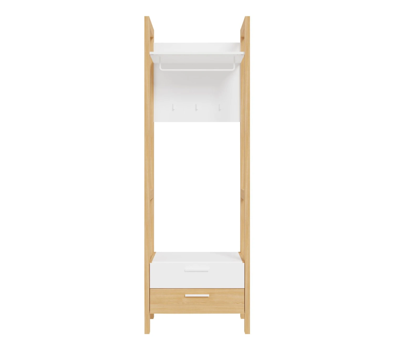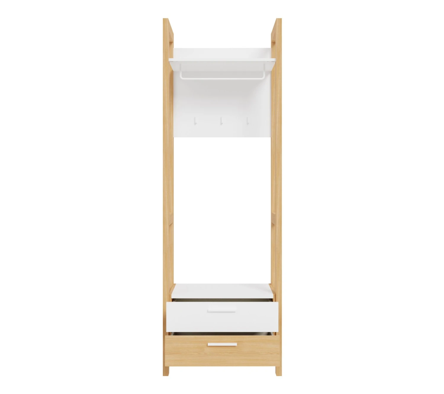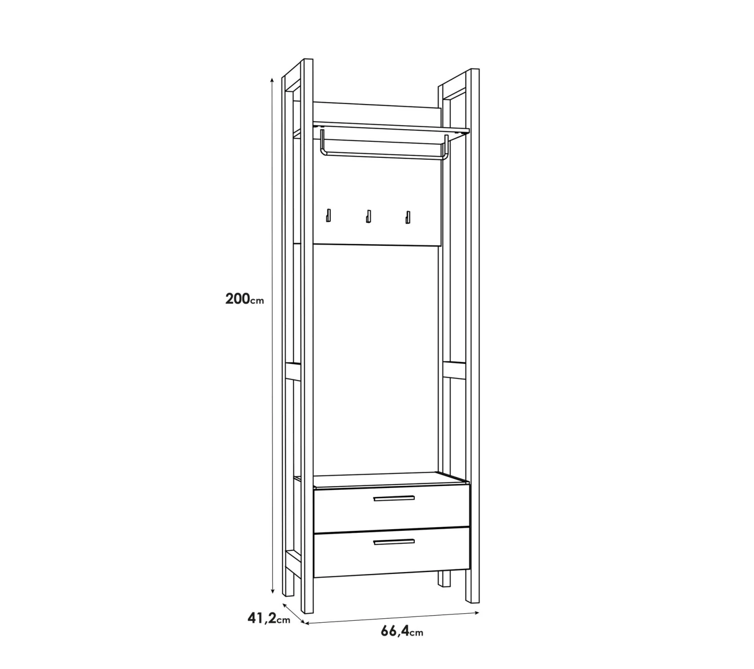 Cette penderie L. 67,2 x H. 200,1 x P. 54,5 cm est un élément qui prend peu de place et rend de grands services. Ce meuble affiche une belle hauteur tout en occupant un espace restreint au sol. Dans sa partie haute, il se dote d’une étagère où vous posez quelques pulls pliés. Juste au-dessous se trouve la tringle, où vous pouvez suspendre robes longues, costumes et manteaux. Cette penderie ouverte possède aussi un bloc de rangement comportant deux tiroirs dans sa partie basse où vous pouvez placer des accessoires. Construite en panneaux de particules, elle présente une structure robuste.