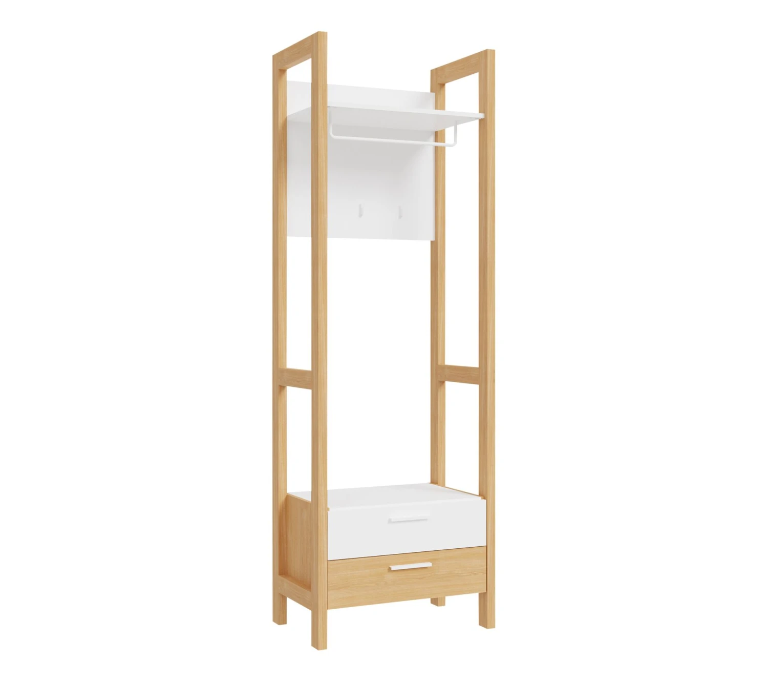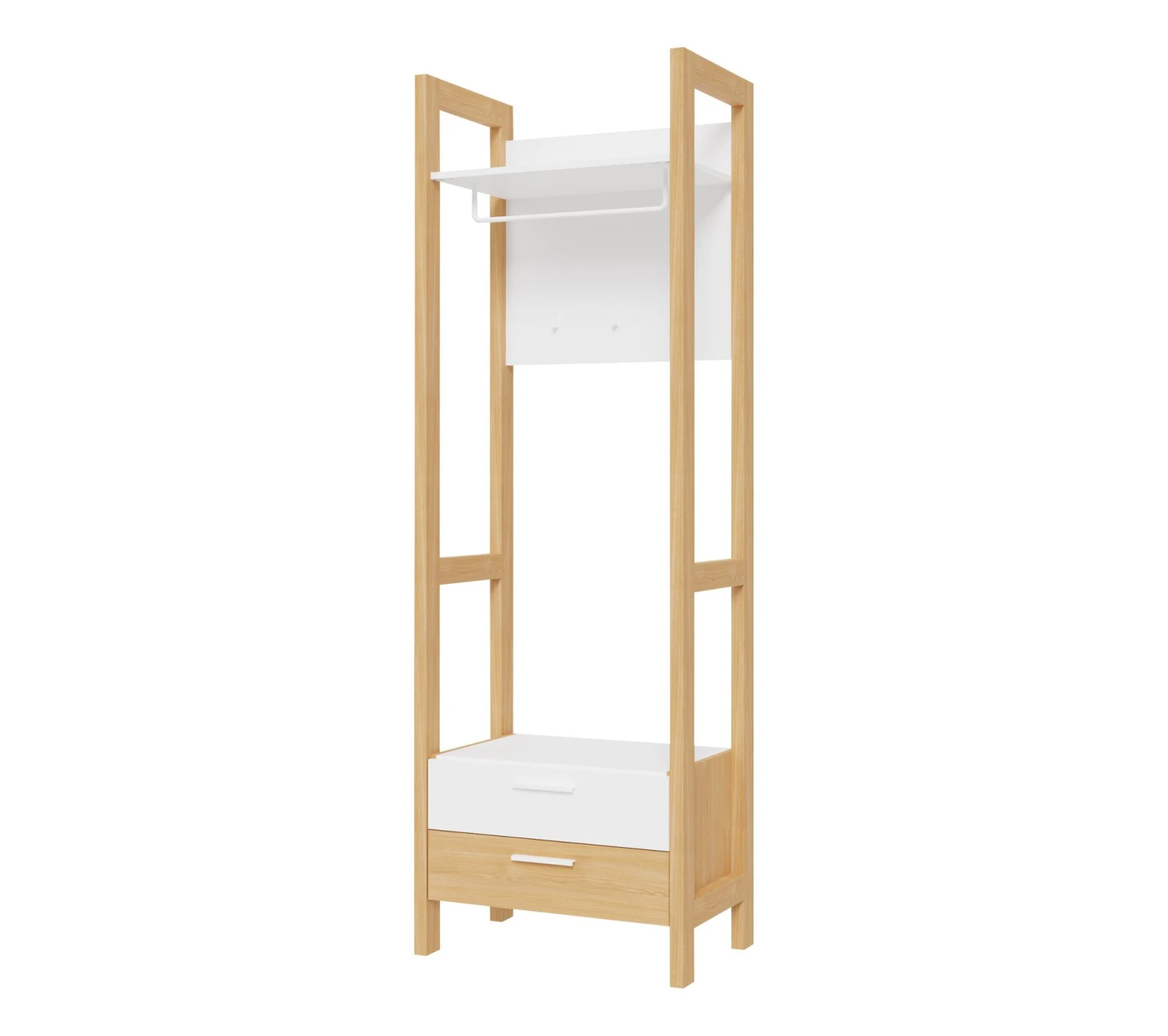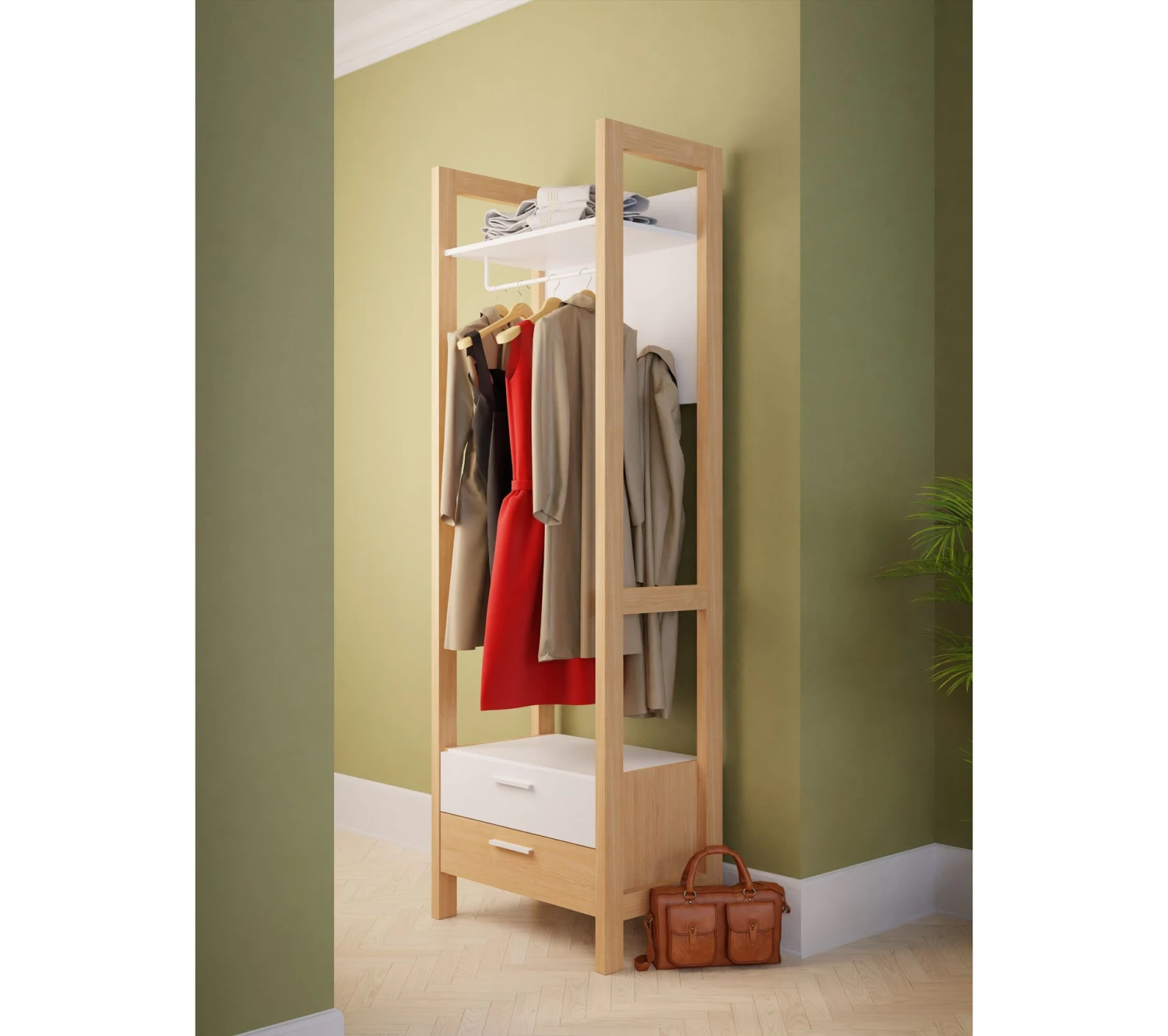 Cette penderie L. 67,2 x H. 200,1 x P. 54,5 cm est un élément qui prend peu de place et rend de grands services. Ce meuble affiche une belle hauteur tout en occupant un espace restreint au sol. Dans sa partie haute, il se dote d’une étagère où vous posez quelques pulls pliés. Juste au-dessous se trouve la tringle, où vous pouvez suspendre robes longues, costumes et manteaux. Cette penderie ouverte possède aussi un bloc de rangement comportant deux tiroirs dans sa partie basse où vous pouvez placer des accessoires. Construite en panneaux de particules, elle présente une structure robuste.
